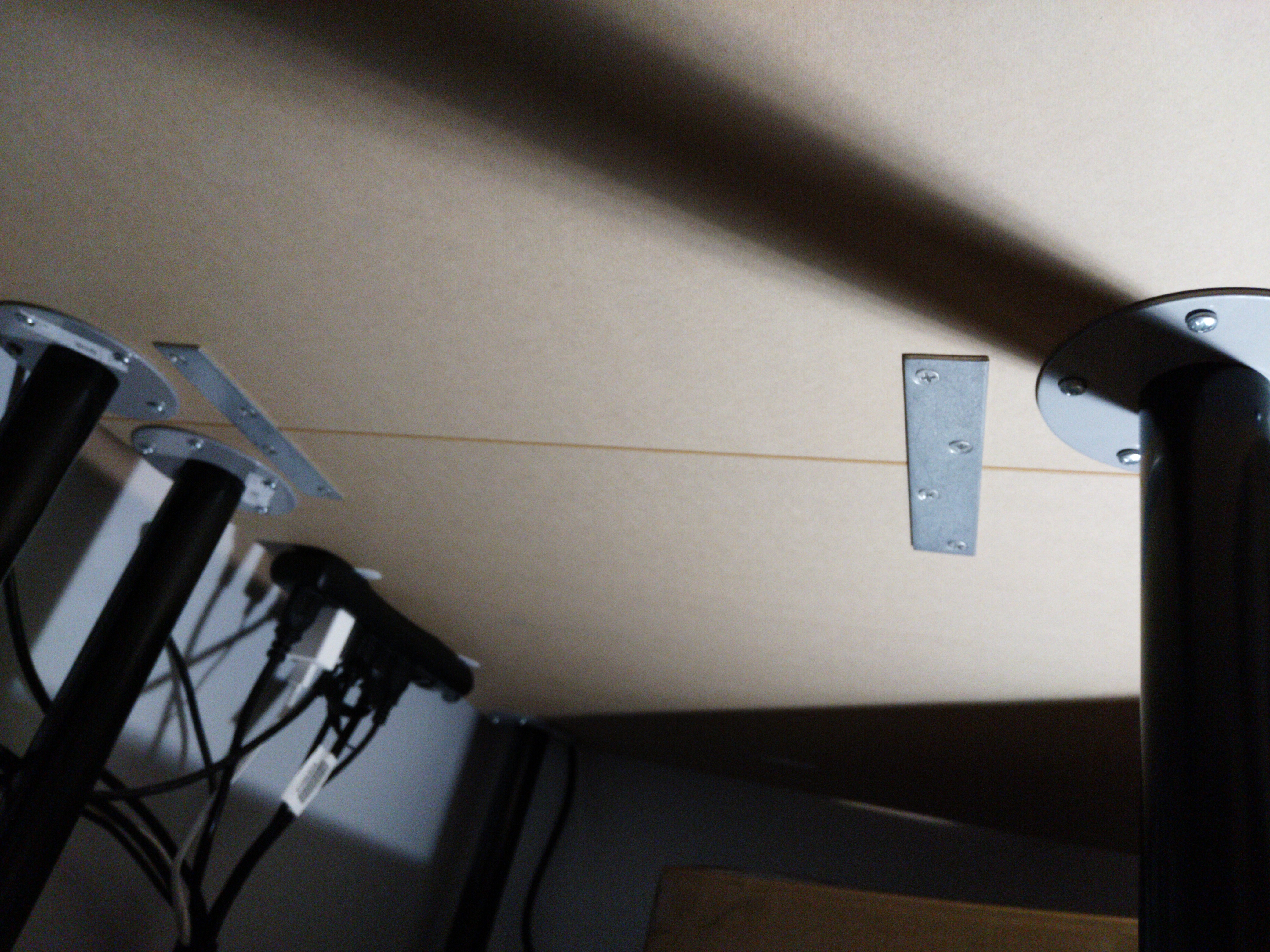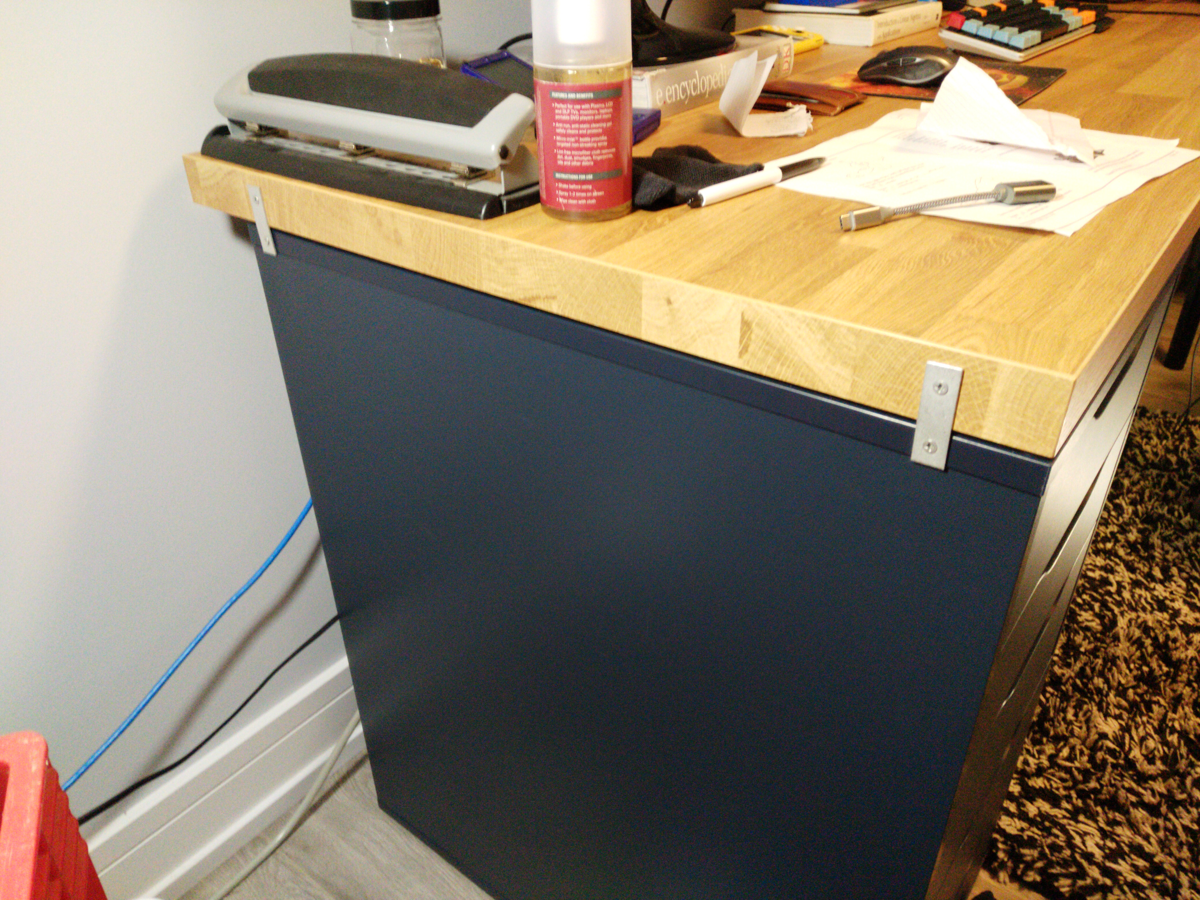 Finally, I used the smaller straps to straighten out my warped countertop. I screwed them to the outside of the drawers and countertop, while someone pushed down on the countertop. This completely removed the warp from the countertop. There was a slight warp on the other desk but I determined it wasn't necessary.